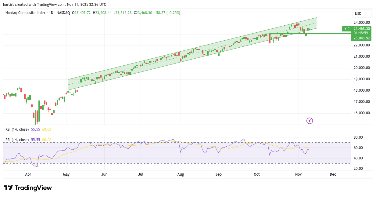 Dit is toch wel ijzersterk! Na maar liefst twee slotkoersen onder het geweldige stijgende trendkanaal keert de Nasdaq gewoon weer terug binnen dat kanaal! Heel, heel sterk.