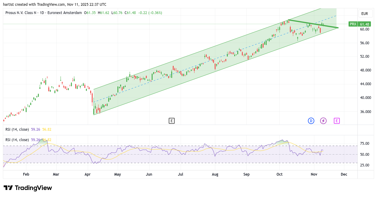 De derde grafiek is ook een mooie, vooral als u long zit. Om te beginnen kijken we naar het mooie stijgende trendkanaal. Daarbinnen gaat de koers van Prosus prima omhoog. Vervolgens kijken we naar helemaal rechts op de grafiek. Daar hebben we de groene dalende trendlijn en met een vergrootglas ziet u dat de recente twee slotkoersen daarboven liggen. Een longpositie is zeker gerechtvaardigd. Kijk wel even waar uw stop komt.