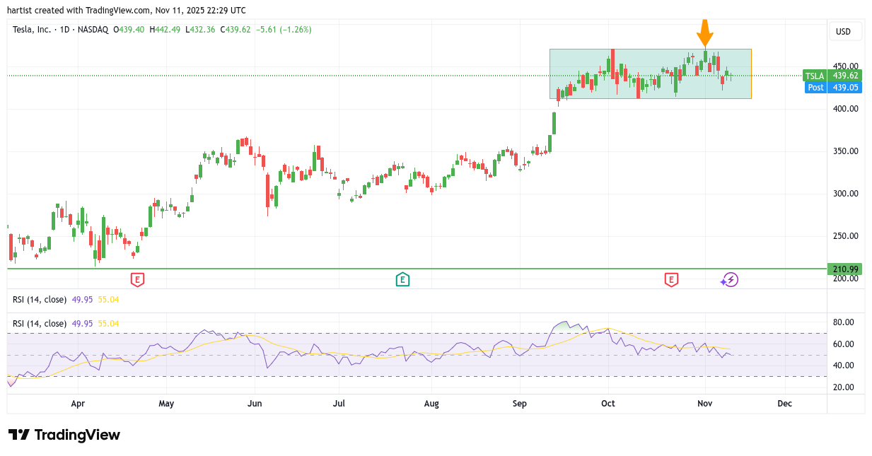 Na een mooie stijging doet Tesla het rustiger aan en gaat het binnen een bandbreedte per saldo zijwaarts. Dat is niet ongewoon dat een koers na een duidelijke beweging, hier opwaarts, even een nieuw evenwicht zoekt. Kijk onder de oranje pijl: de koers ging mooi omhoog met een duidelijke groene candle met een slotkoers op de weerstand van het blok. Je zou op basis daarvan meer verwachten, maar de weerstand deed zijn werk en verkopers namen het over.