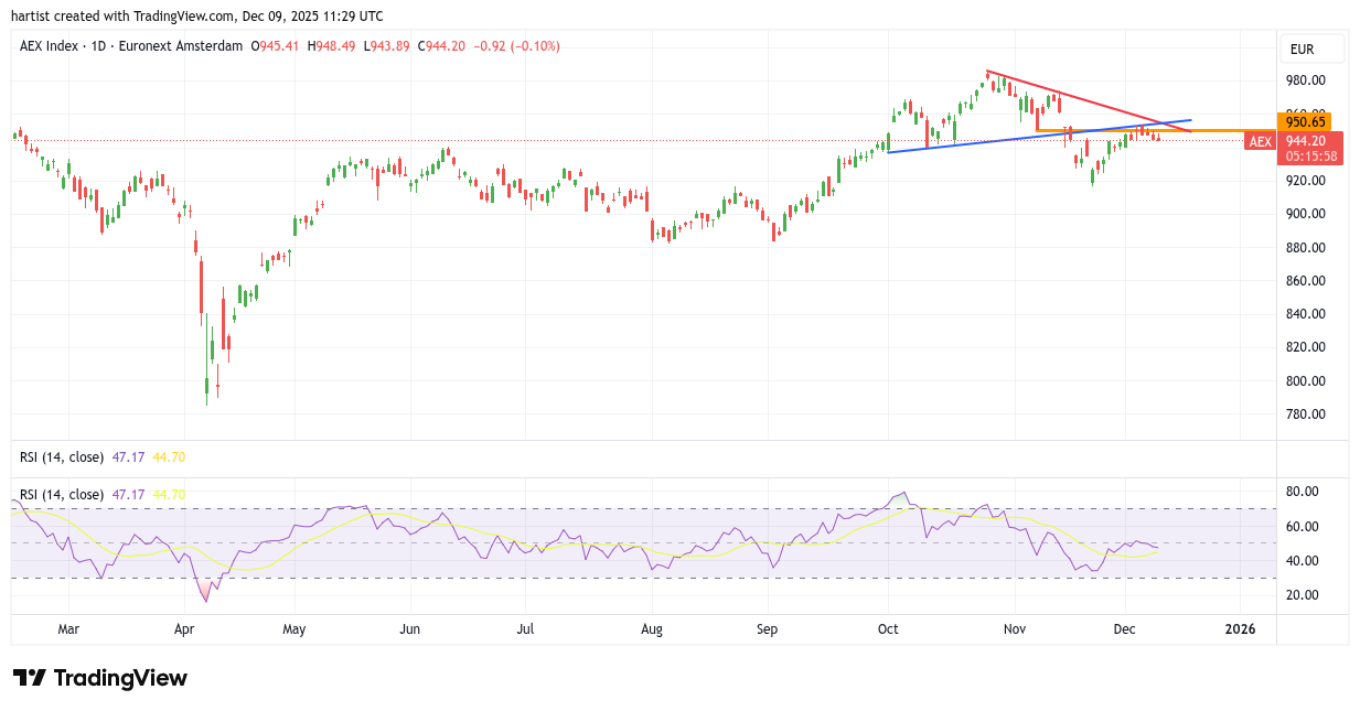 De dubbele weerstand, gevormd door de oranje horizontale lijn en de blauwe intra-chart-lijn, is tot op moment van schrijven te sterk om de koers van de AEX verder te laten stijgen. Daarnaast komt de rode dalende trendlijn eraan. Met deze grafiek zou ik niet graag long zitten.