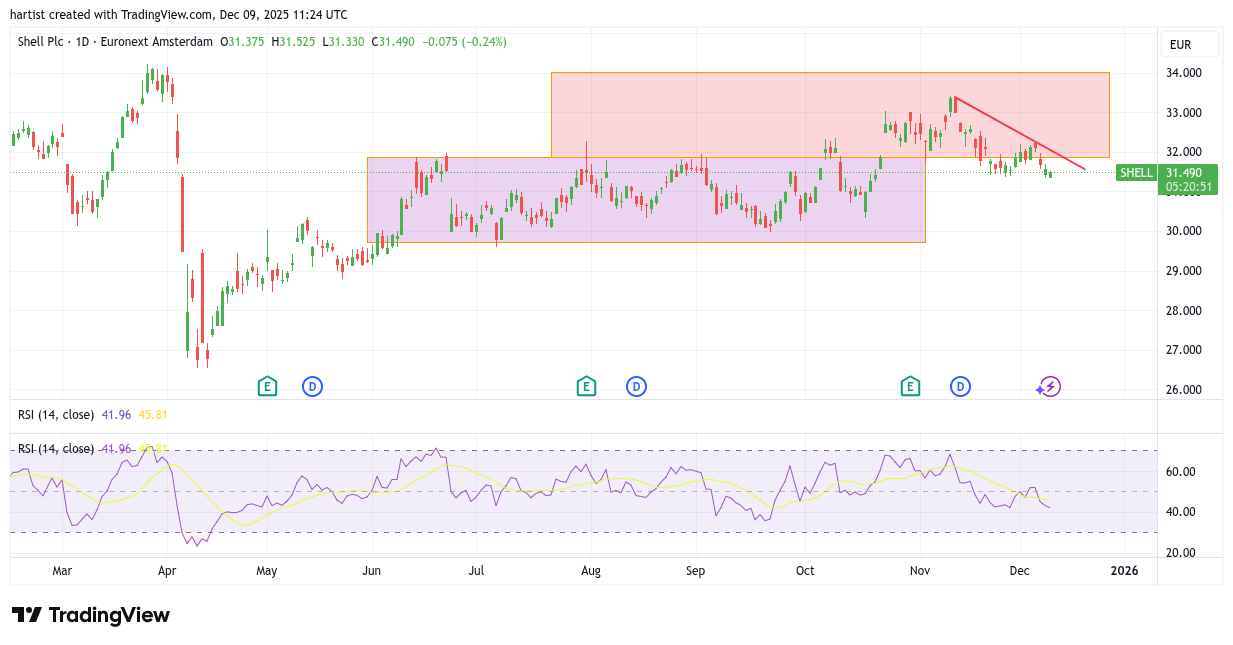 Met een verwijzing naar de grafiek van Tesla heb ik ook hier de blokjes laten staan. Toen Shell opwaarts uit de paarse tradingrange brak werd de bovenzijde van het rode blok de target. Alhoewel de koers meer bij de target in de buurt kwam dan bij Tesla, werd ook hier de target niet gehaald. Zowel bij Tesla als bij Shell zal ik bij een volgende bespreking de blokjes weghalen.