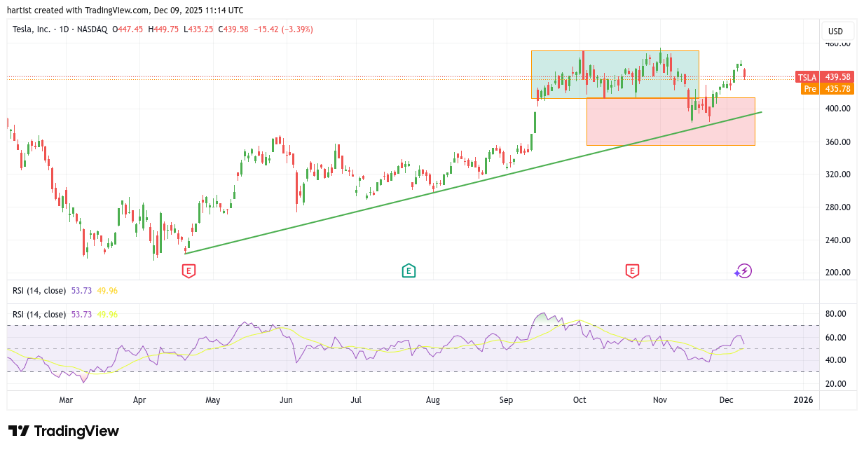 Boven de groene lijn zie ik een patroon dat veel weg heeft van een dubbele top, iets anders gevormd dan bij Tesla. Als we hier gaan rekenen dan weten we dat de (neerwaartse) target ruimschoots is gehaald.