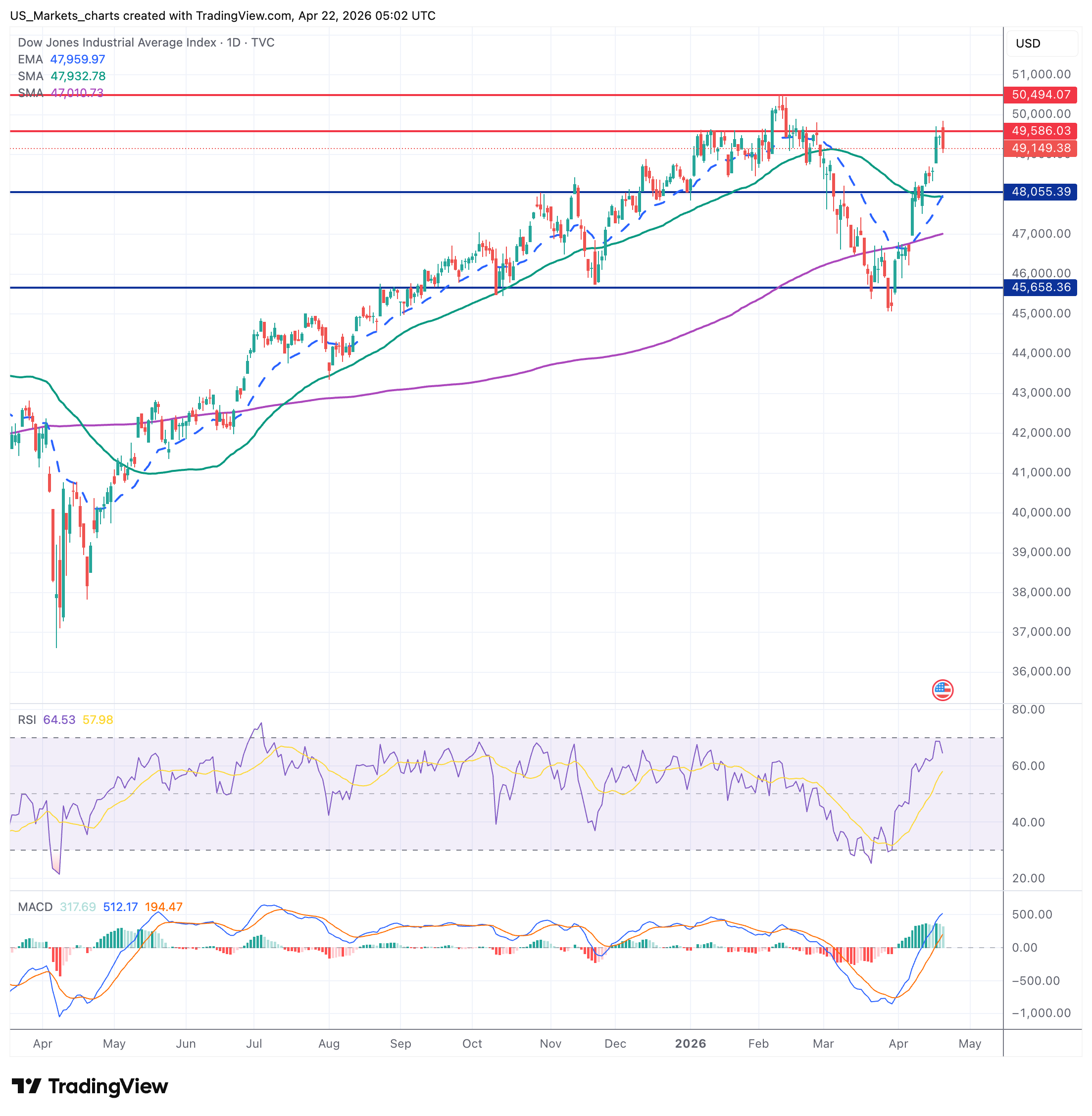 De Dow Jones noteert 49.150 en heeft de flinke comeback vanaf de bodem rond 45.650 bijna voltooid. De belangrijke zone rond 48.055 werd ruim gepasseerd, en nu ligt de weerstand op 49.600 binnen bereik en die werd dinsdag al even getest. Daarboven wacht de all-time high rond 50.500 van begin februari.