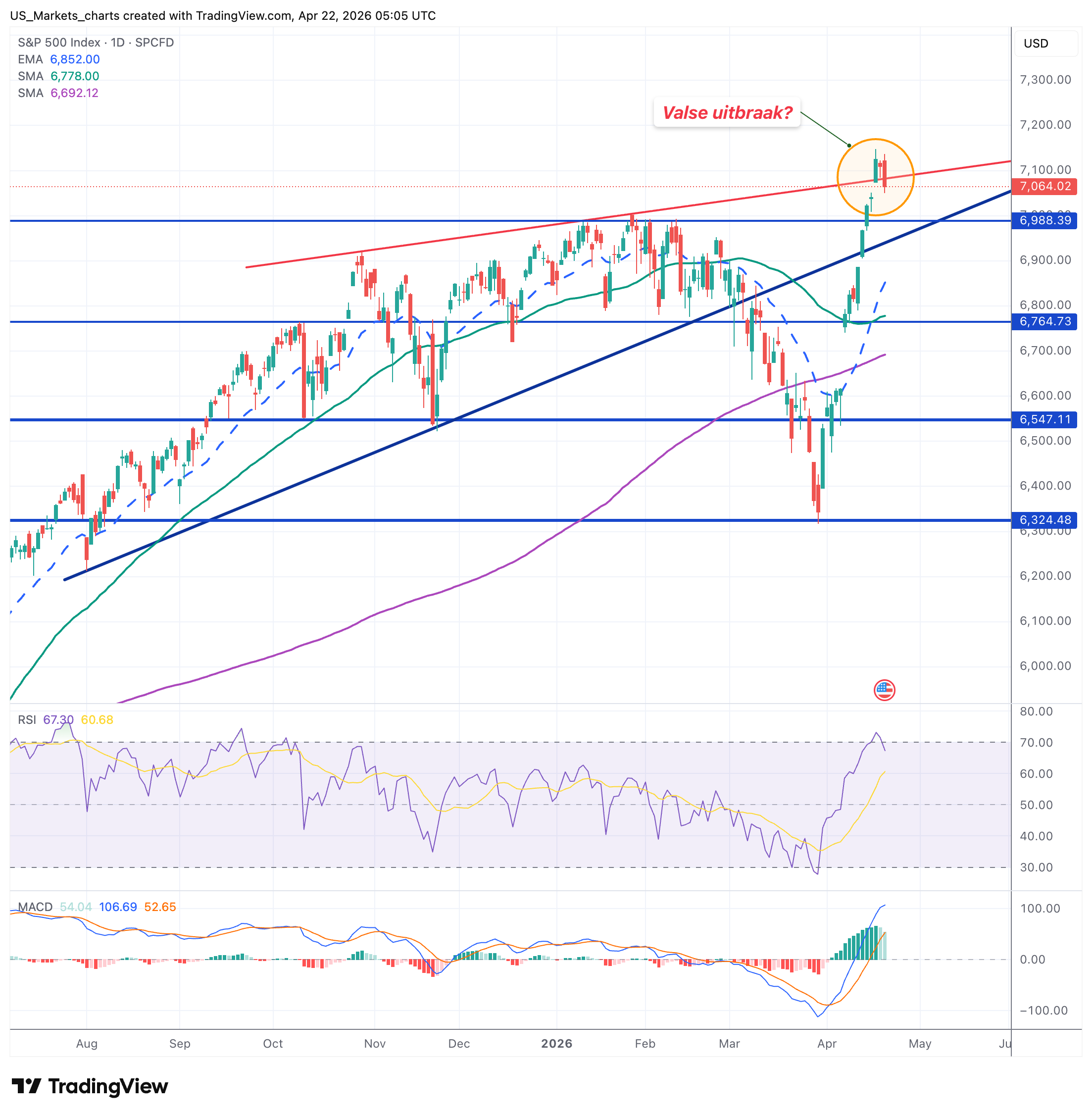 De S&P 500 raakte deze week 7.125 opnieuw aan, maar viel daarna direct terug tot rond de 7.065. Op de grafiek is het patroon van een mogelijk valse uitbraak duidelijk zichtbaar: de koers prikte door de rode trendlijn heen, maar kon er niet boven sluiten. Dat is een klassiek waarschuwingssignaal na een sterke rally.