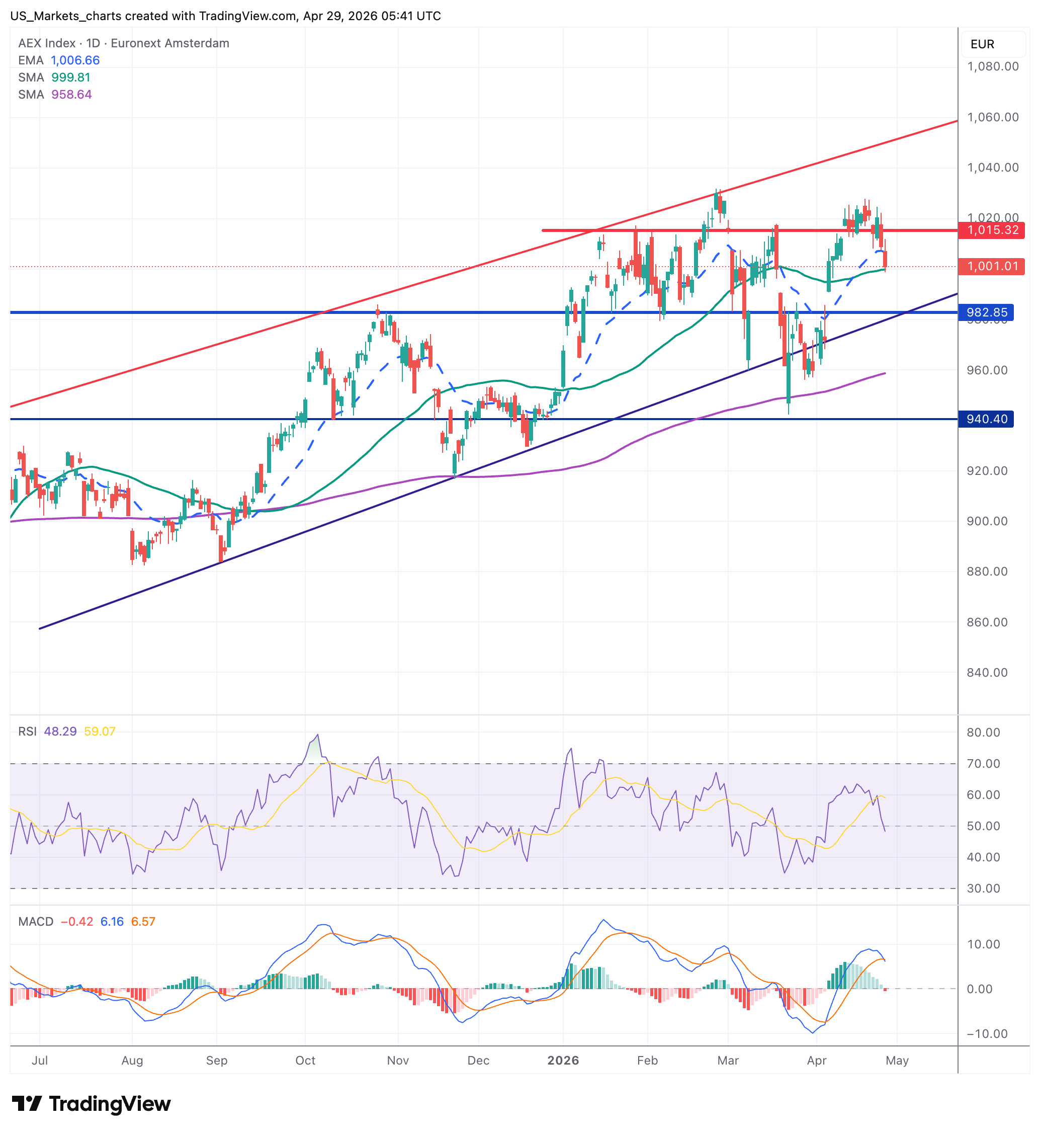 De RSI is gezakt naar 48, ruim onder de gele signaallijn op 59 en onder het neutrale 50-niveau. De MACD is negatief omgedraaid, een klassiek verkoopsignaal. Het MACD-histogram is rood. Onder 1.001 ligt eerst nog 999 als steun, daarna 983 als volgende structurele steun. Een correctie van -2% richting 983 lijkt nu het meest waarschijnlijke scenario, zeker als Wall Street vanavond met teleurstellende Mag Four-cijfers komt.