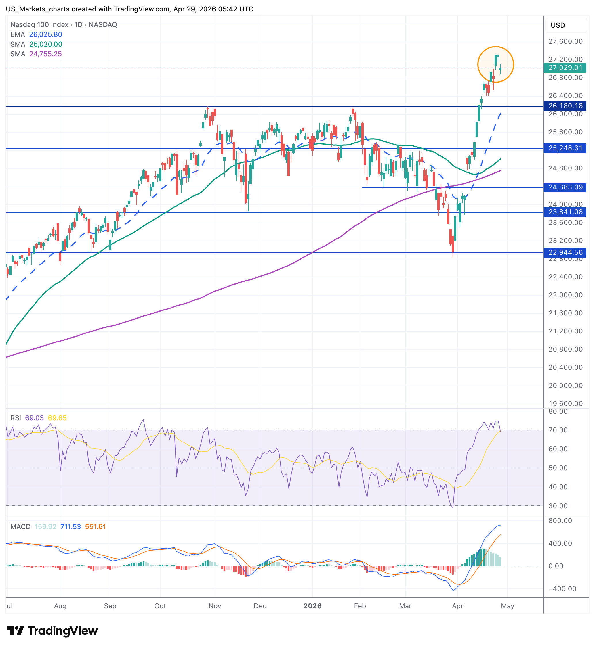 De RSI is gezakt naar 69 en kruist de gele signaallijn neerwaarts, een eerste verkoopsignaal. De MACD blijft positief maar we zien het histogram zichtbaar krimpen. Onder de 27.000 is de eerste serieuze steun 26.180, daarboven wel nog wat steun rond de 26.500. De richting van de Nasdaq 100 vandaag wordt vrijwel volledig bepaald door wat de Mag Four vanavond na het slot gaan rapporteren. Bij een teleurstelling kan er mogelijk een stevige correctie naar 26.180 volgen, bij meevallende cijfers kunnen we direct nieuwe records zien.