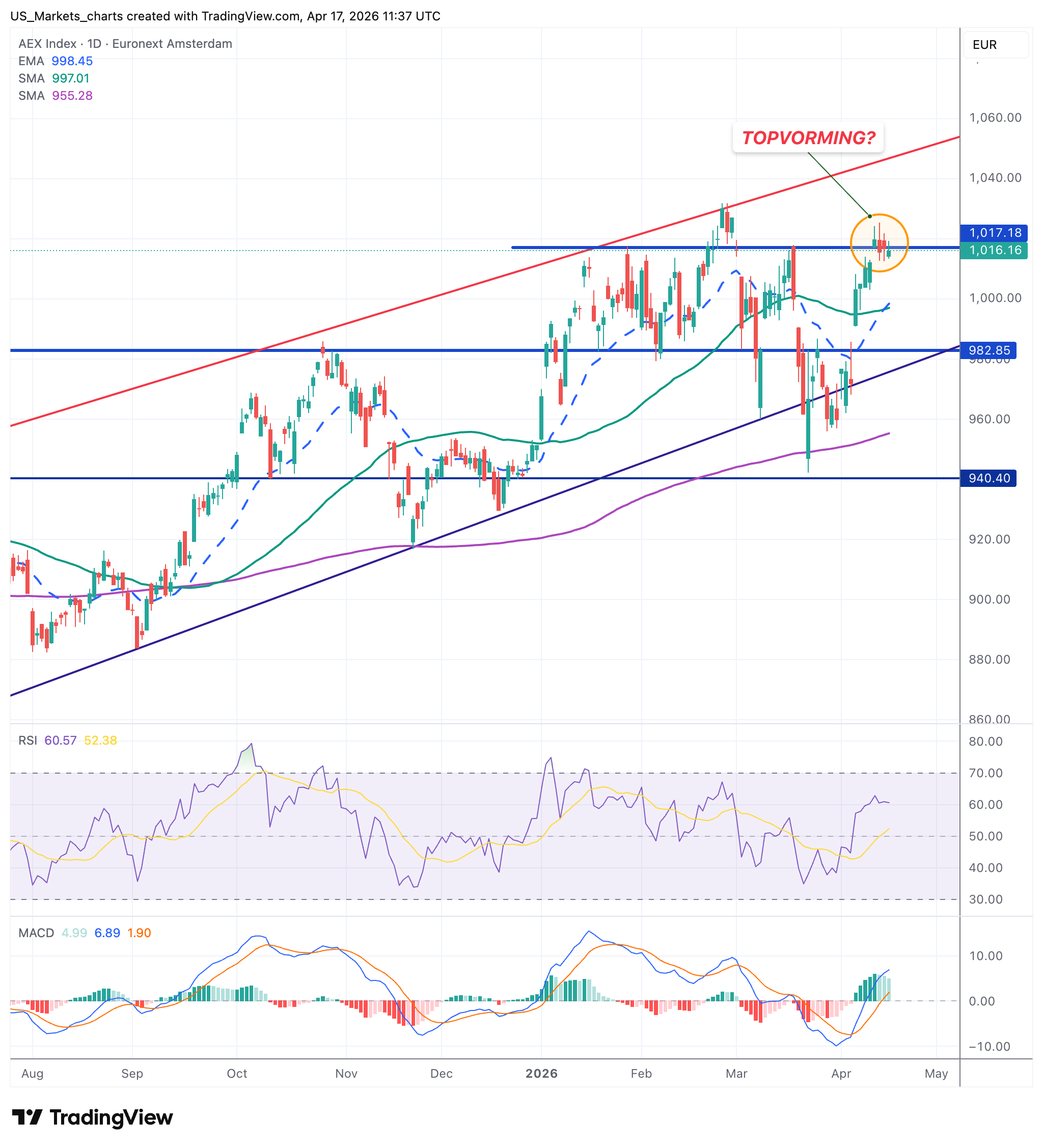 De AEX staat op 1.017, precies op de horizontale weerstand rond de 1.015 die al meerdere keren als plafond heeft gefunctioneerd. De grafiek toont duidelijk de annotatie "TOPVORMING" bij dit niveau. Alle drie de gemiddelden liggen ver onder de koers, wat structureel positief is. De RSI op 61 heeft nog ruimte maar nadert overbought. De MACD is positief en de histogram groeit. De vraag is of de AEX nu wel door de 1.015 weerstand kan breken of opnieuw terugvalt.